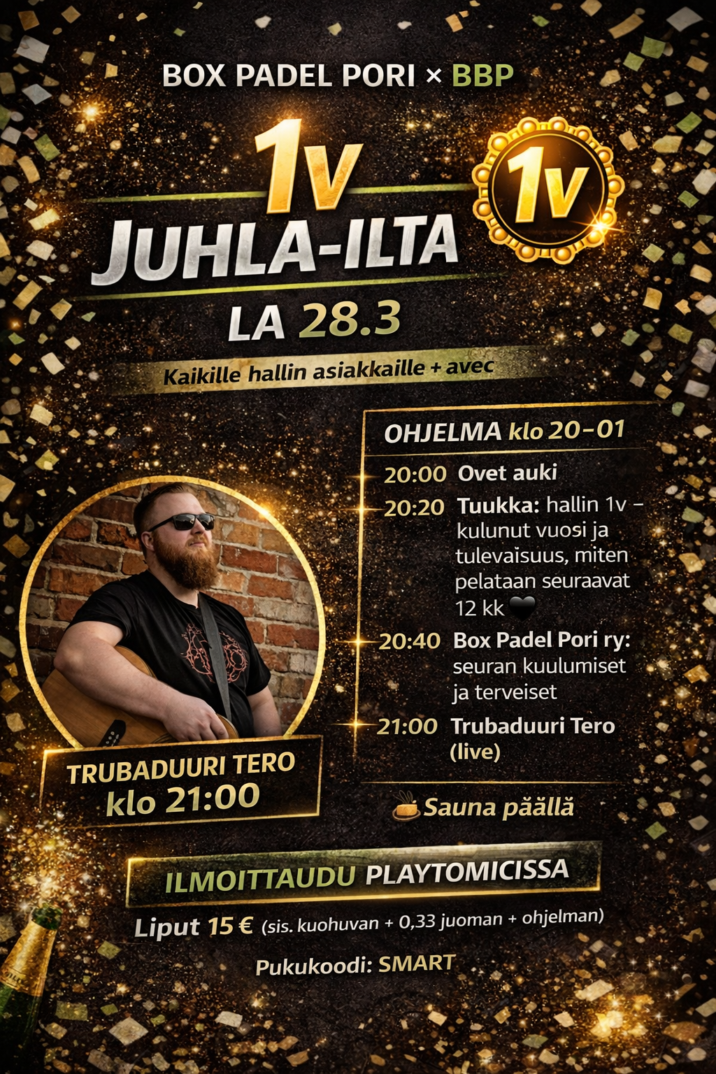 Black Box Padel Pori ja Box Padel Pori ry juhlivat 1-vuotista taivalta lauantaina 28.3. Luvassa on jokunen juhlapuhe, live-musiikkia ja hyvää seuraa. Eli nyt lupalaput kotoa ja varaa illasta aikaa ja tule viihtymään hallilla.