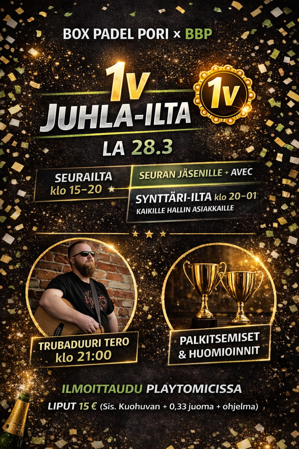 Black Box Padel Pori ja Box Padel Pori ry juhlivat 1-vuotista taivalta lauantaina 28.3. Luvassa on padelia, palkitsemisia, live-musiikkia ja hyvää seuraa – kaksiosainen ilta, jossa ensin vietetään seuraväen osuus ja sen jälkeen juhlitaan yhdessä hallin asiakkaiden kanssa.