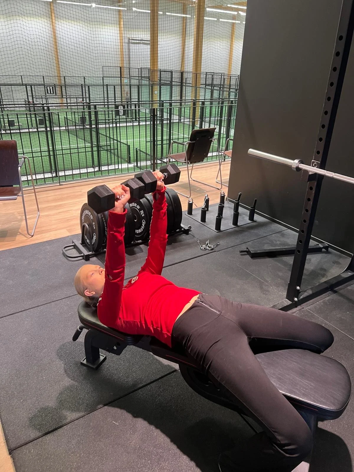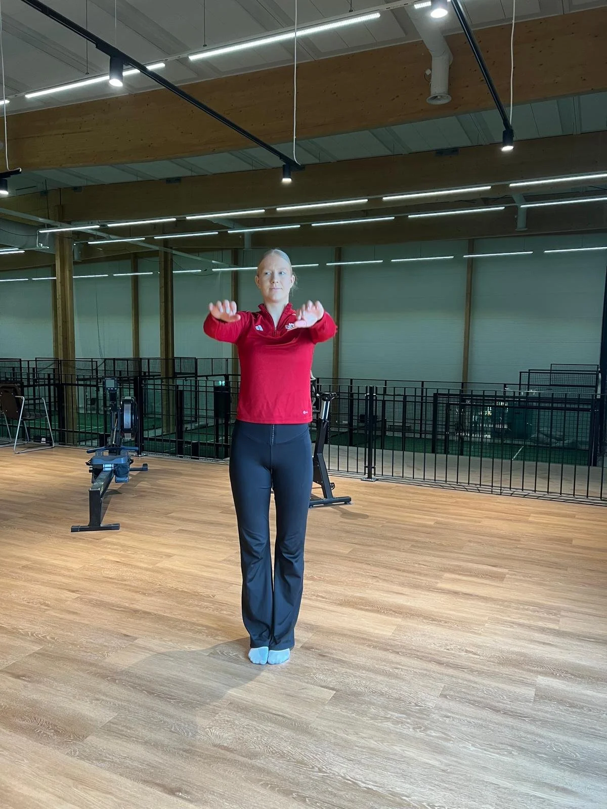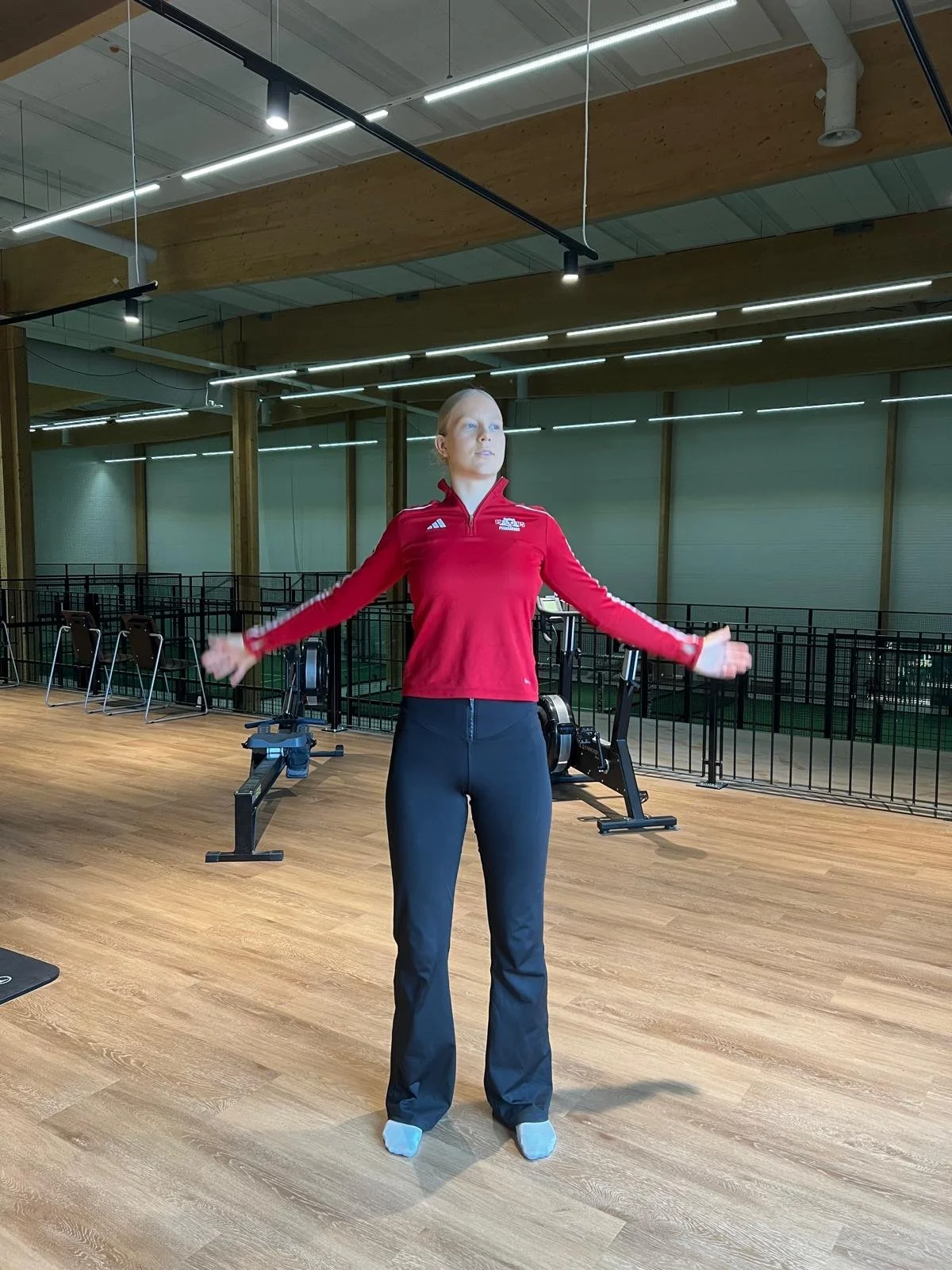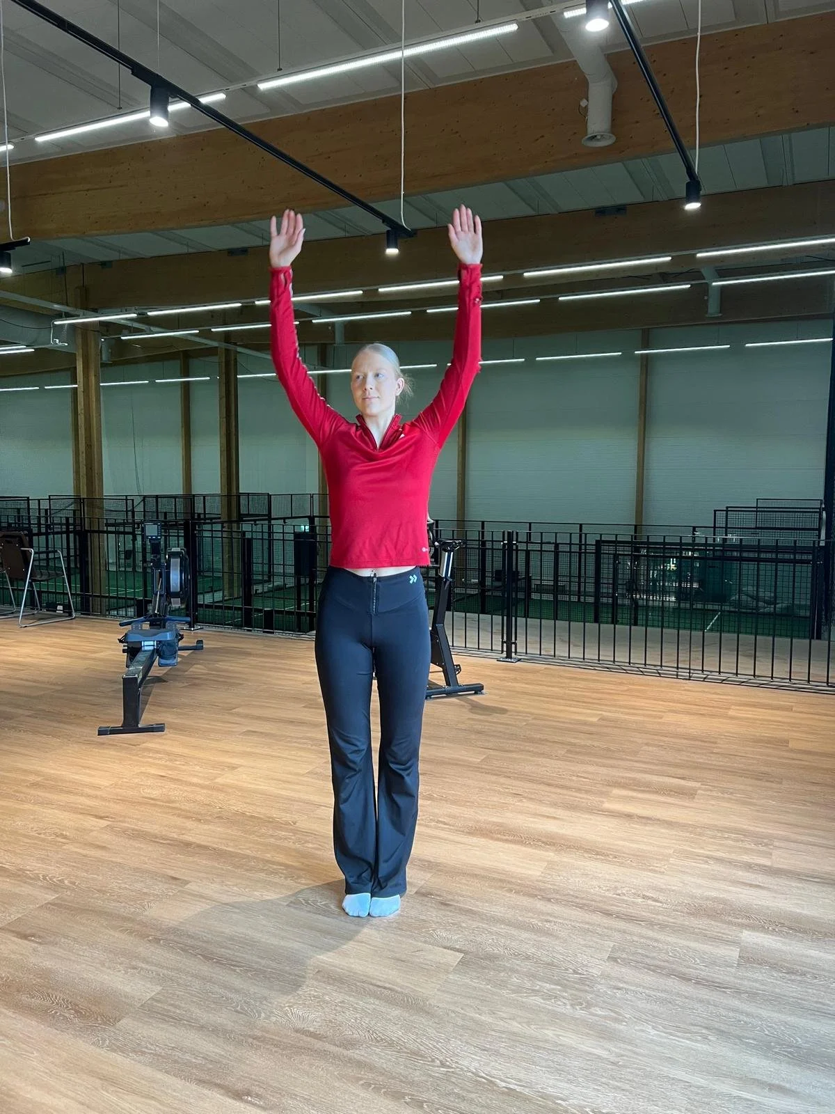 Pidä selkä suorana ja vedä kyynärpäät taakse, ihan lapaluiden viereen, nosta kädet niin, että rystyset ovat kattoon päin, sieltä vielä nosto ylös ja sitten samaa liikerata rauhassa alas.