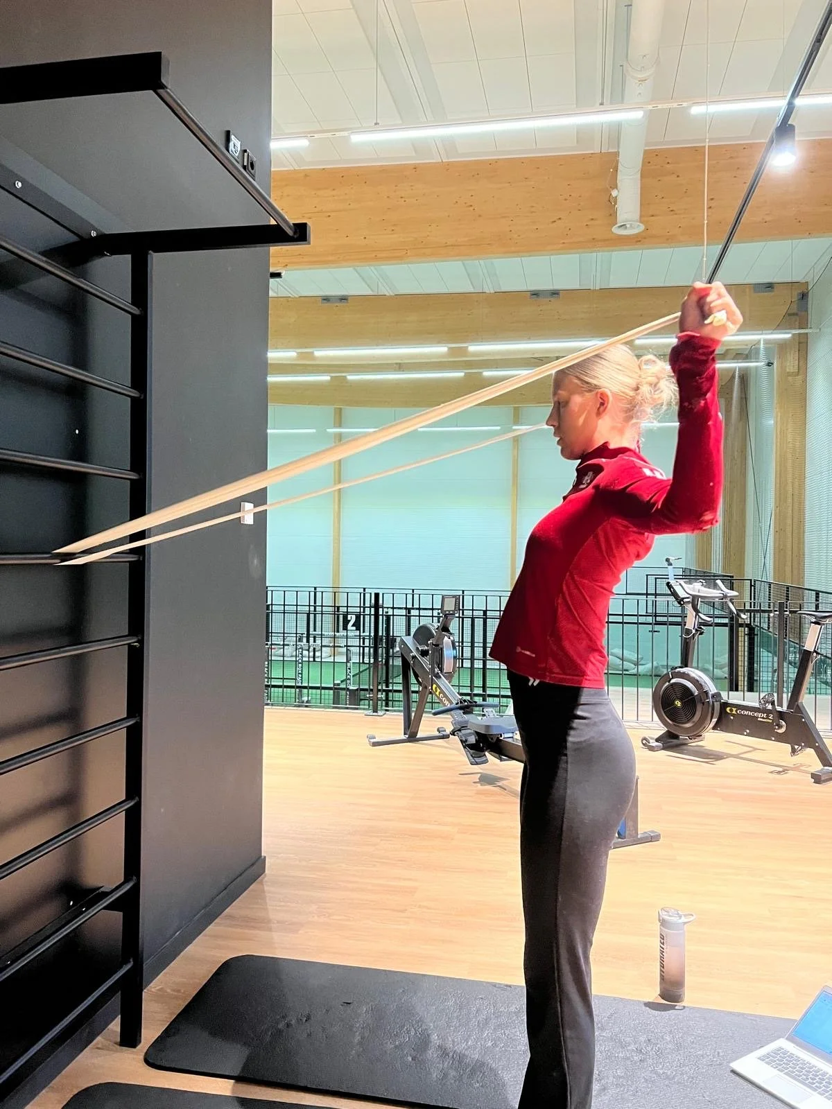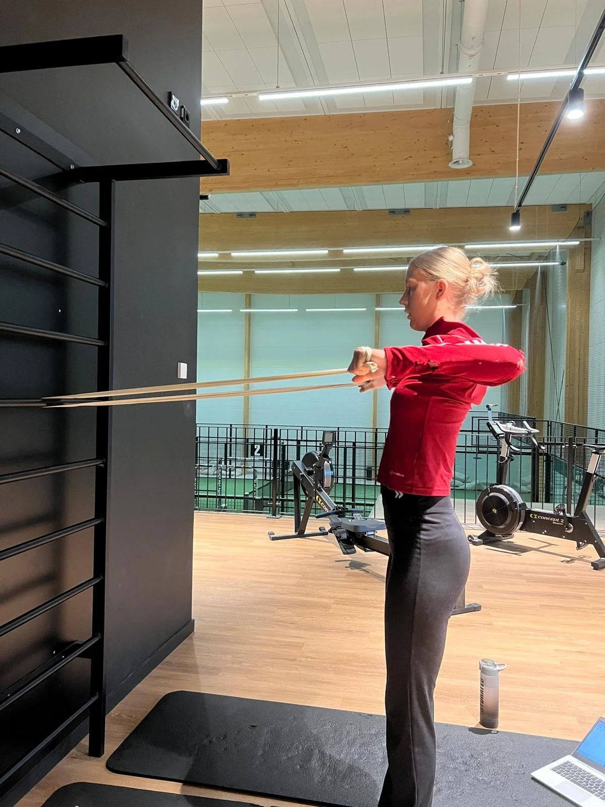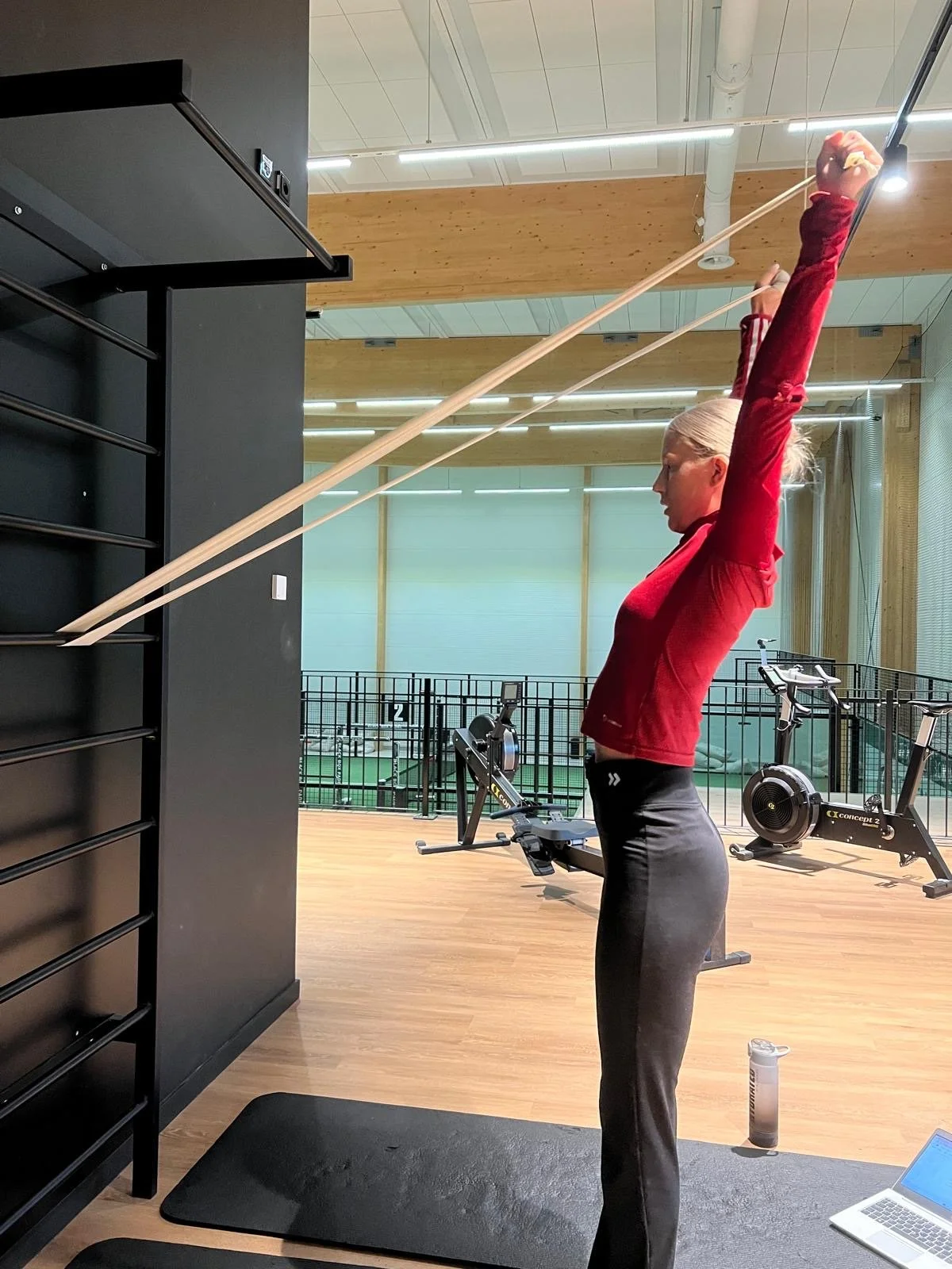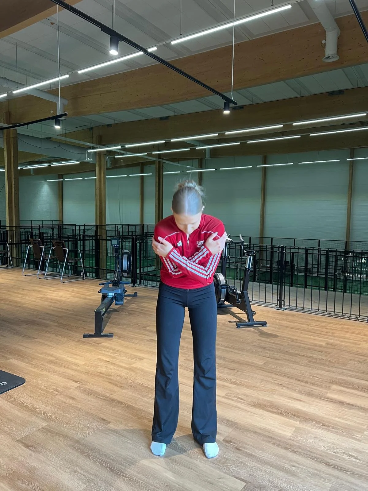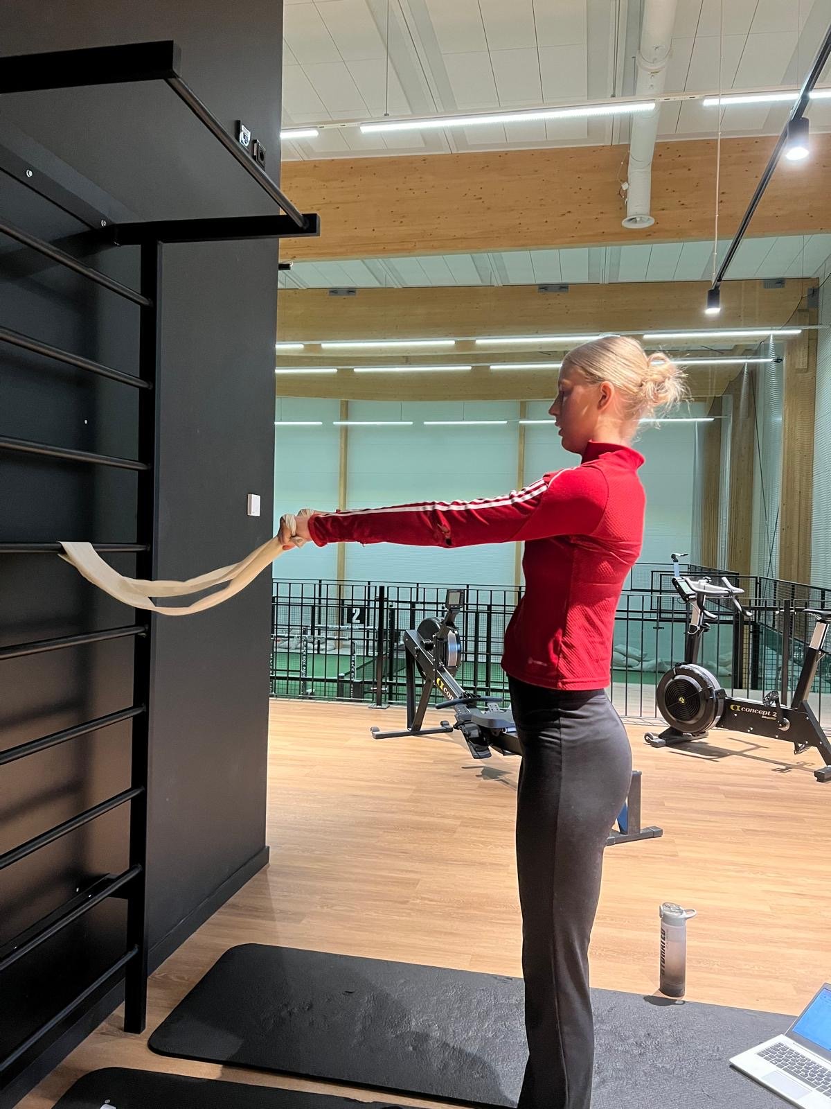Ota kiinni nauhasta ja astu hieman taaksepäin, että nauha kiristyy. Sen pitäisi tuntua erityisesti lapojen välissä ja vähän käsissä. Ota kuminauhasta kiinni ja astu taaksepäin.
