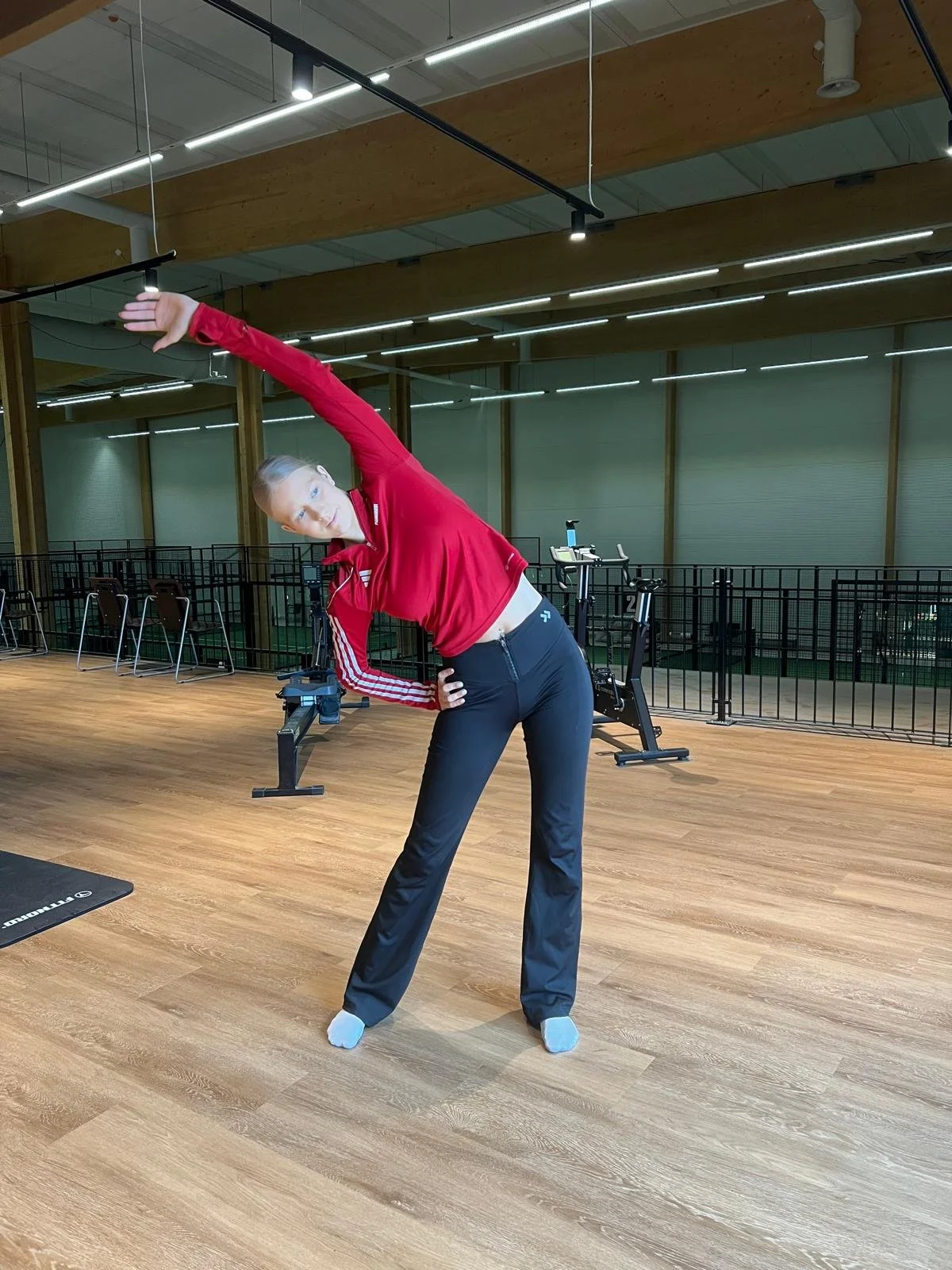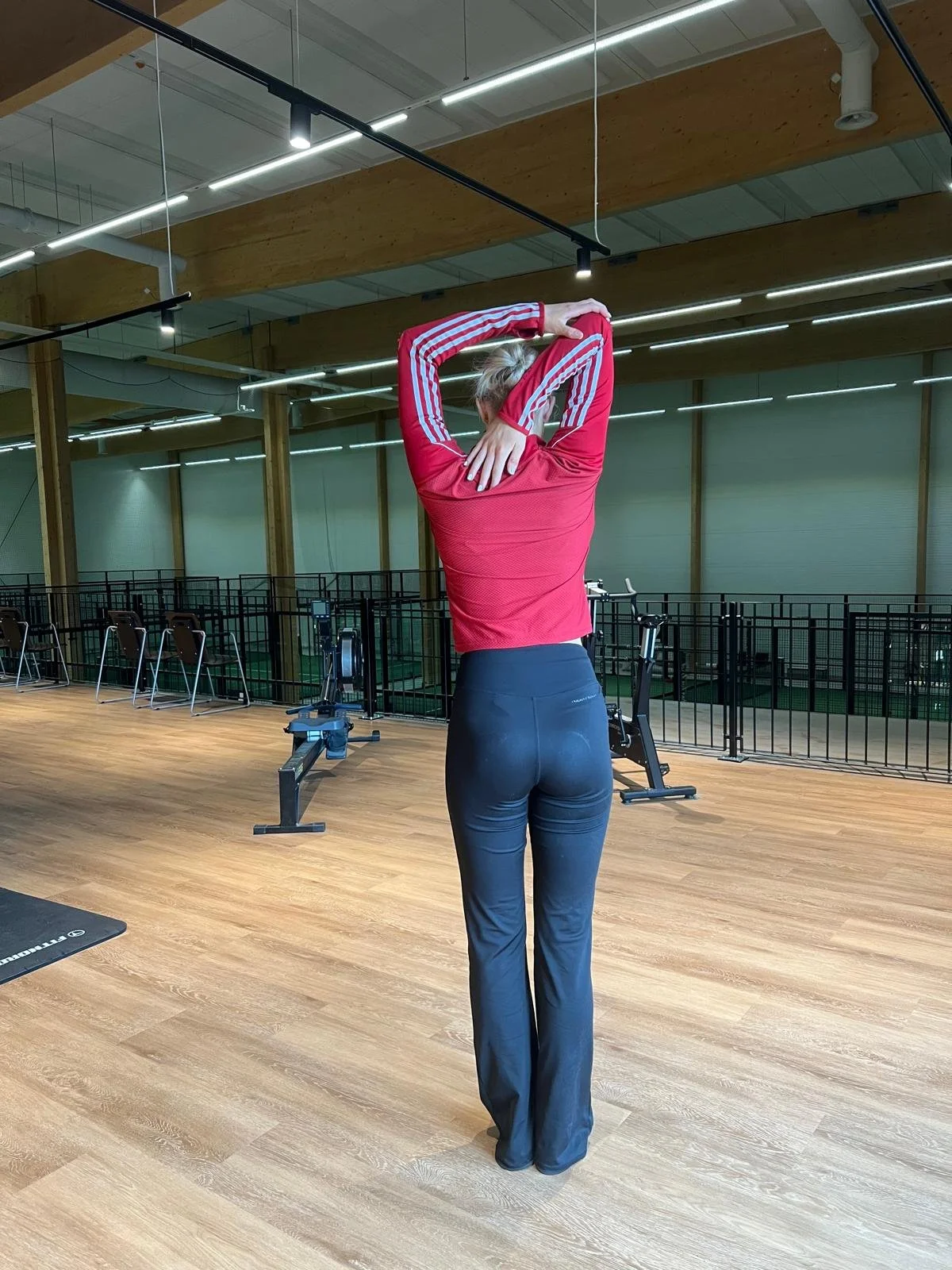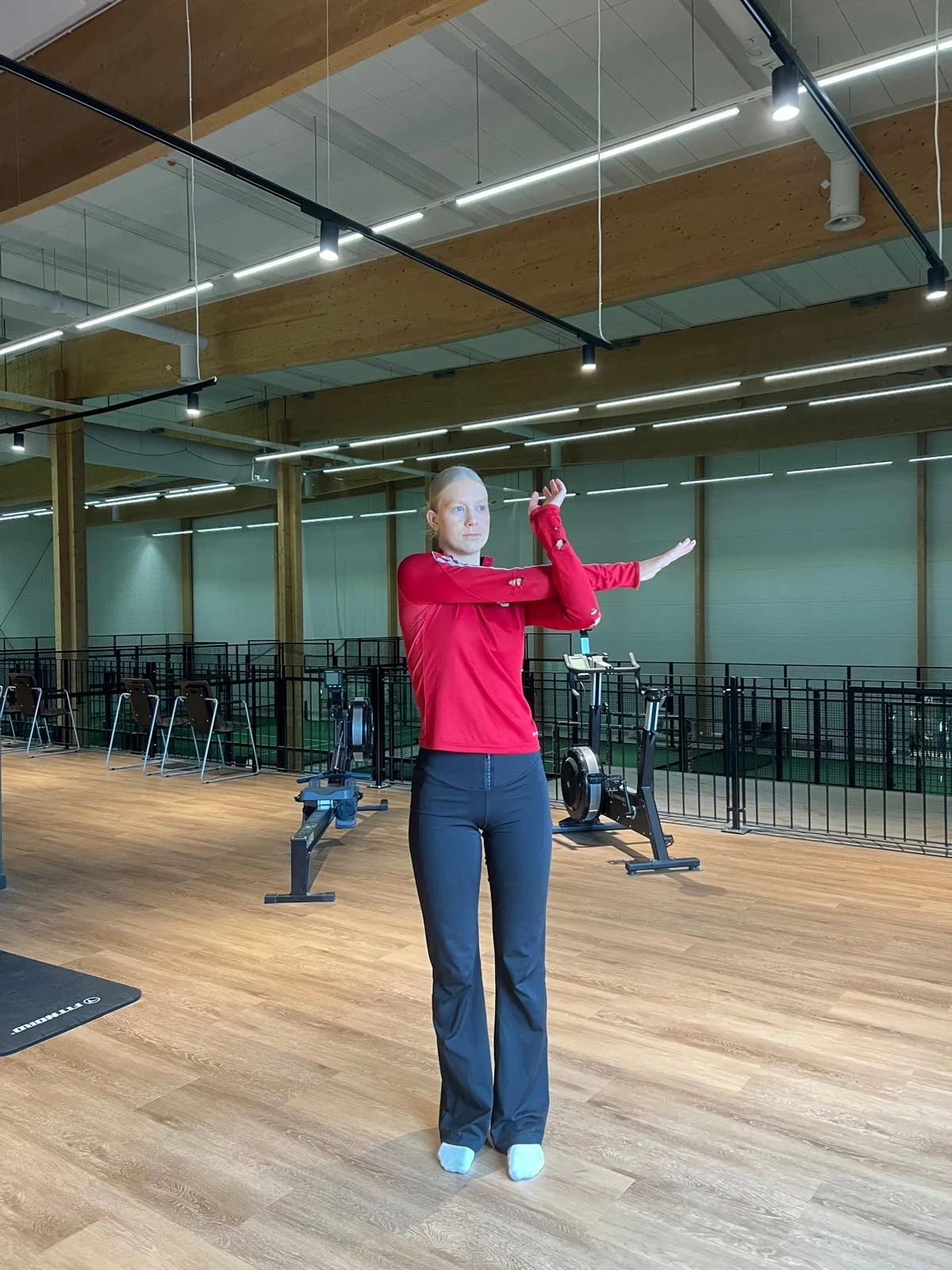 Käsi eteen, kurotus sivullepäin ja toisella kädellä kevyesti kyynerpäästä itseen päin vetäminen.