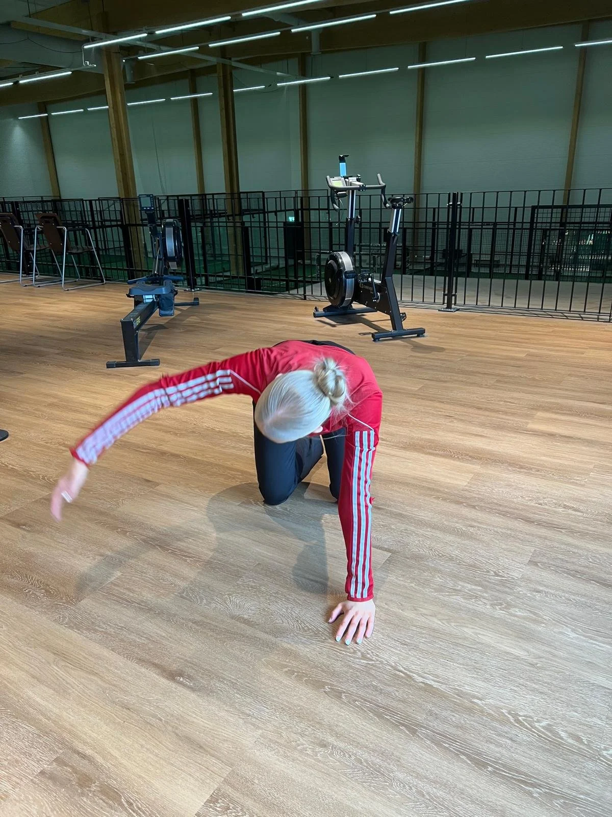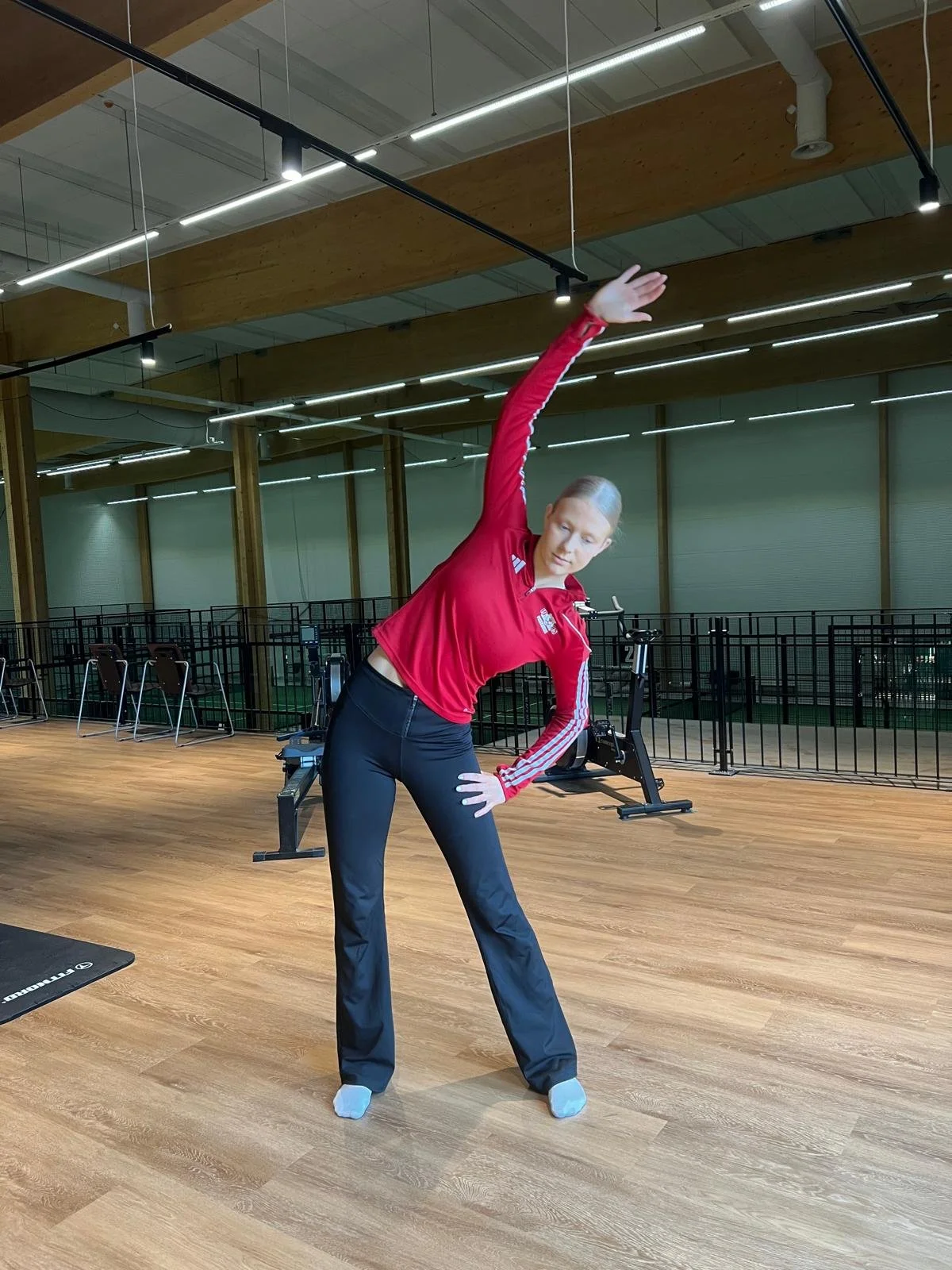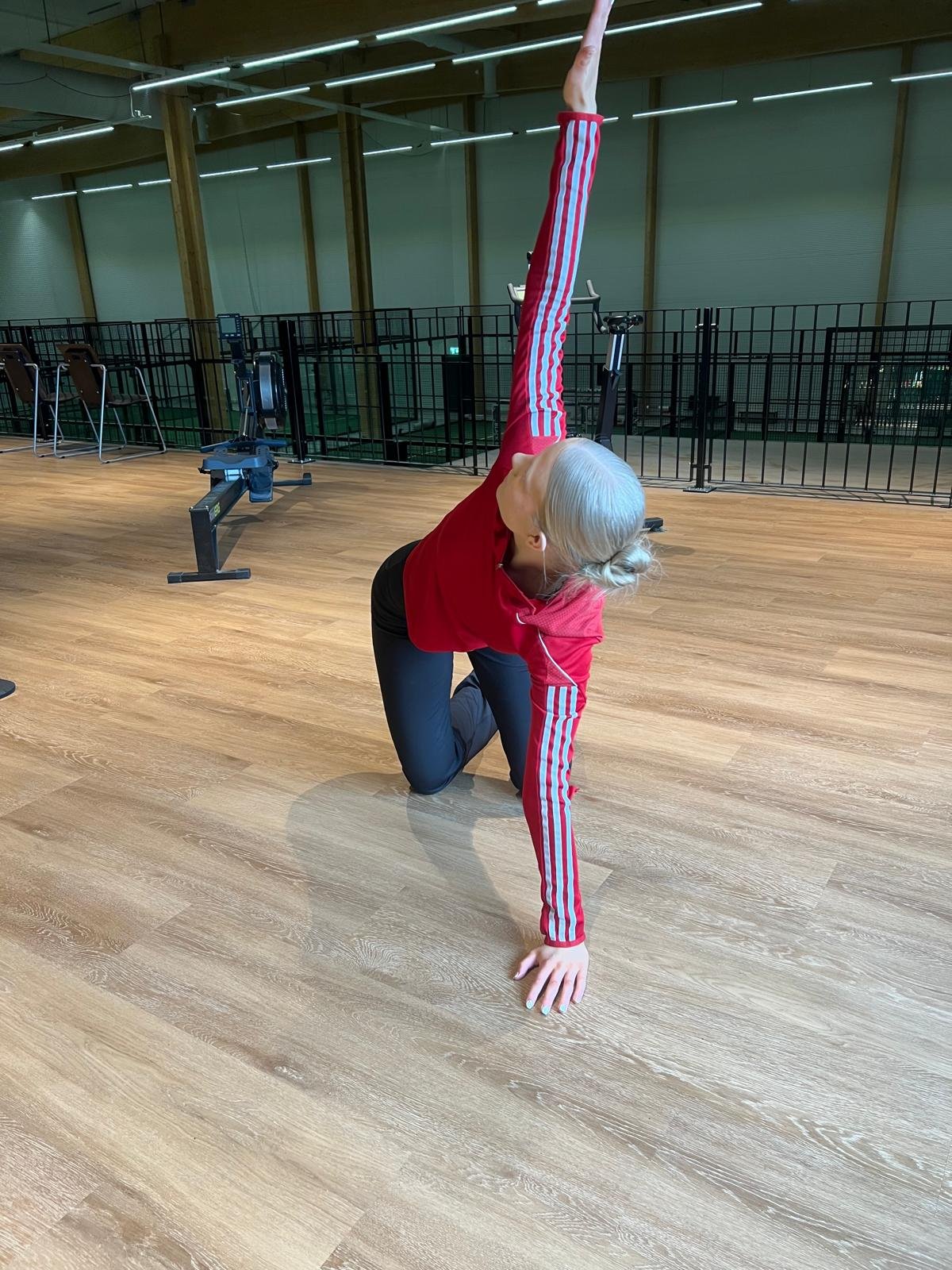Käsi eteen, kurotus sivullepäin ja toisella kädellä kevyesti kyynerpäästä itseen päin vetäminen.