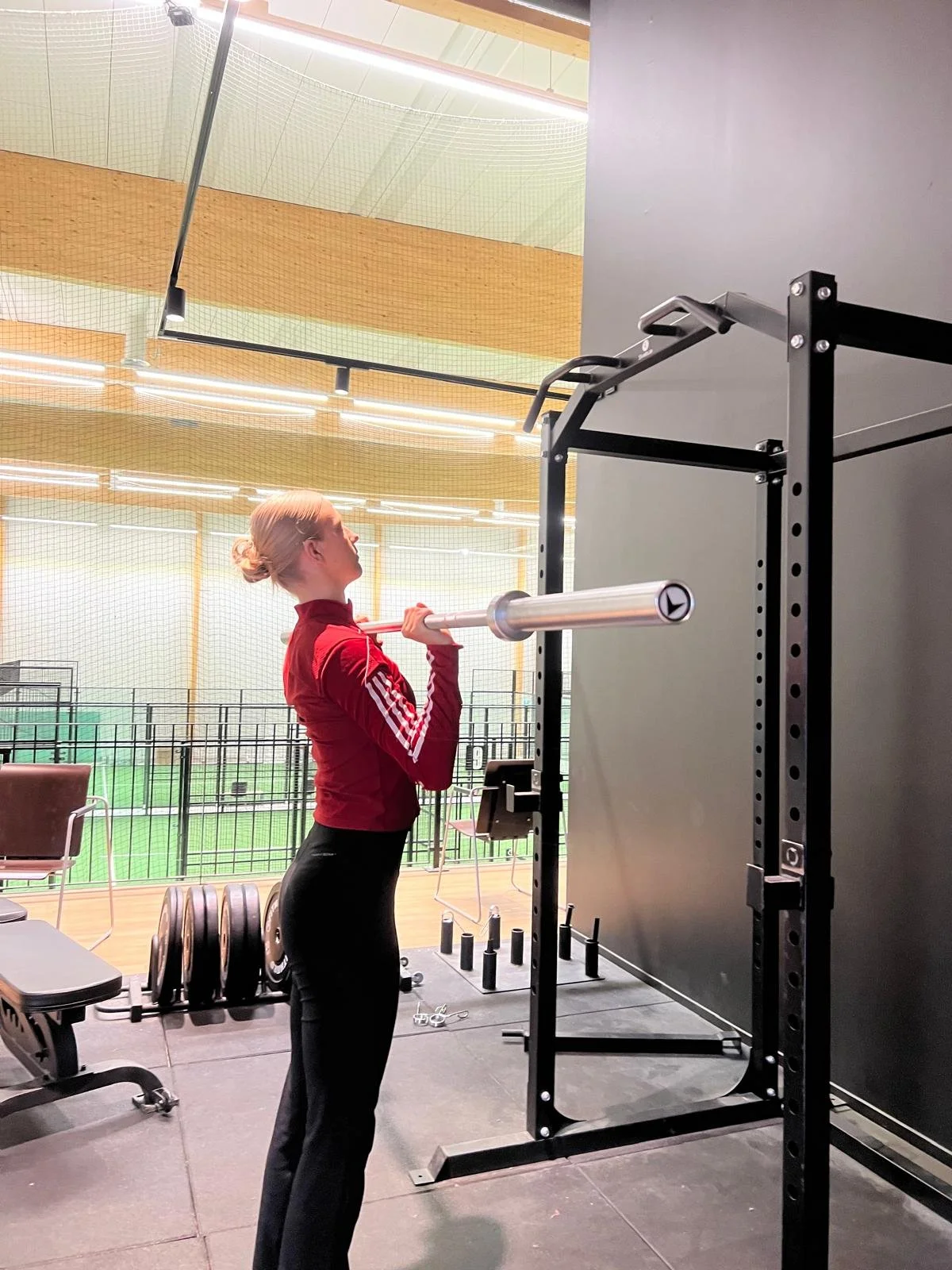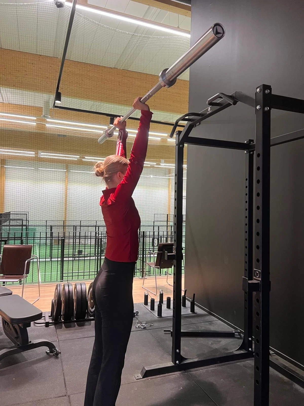 Vahva keskivartalo, älä notkista selkää. Tangon liike suoraan ylös, tanko lähtee rinnan päältä. Pää väistää tankoa. Rauhallisesti alas, räjähtävästi ylös.
