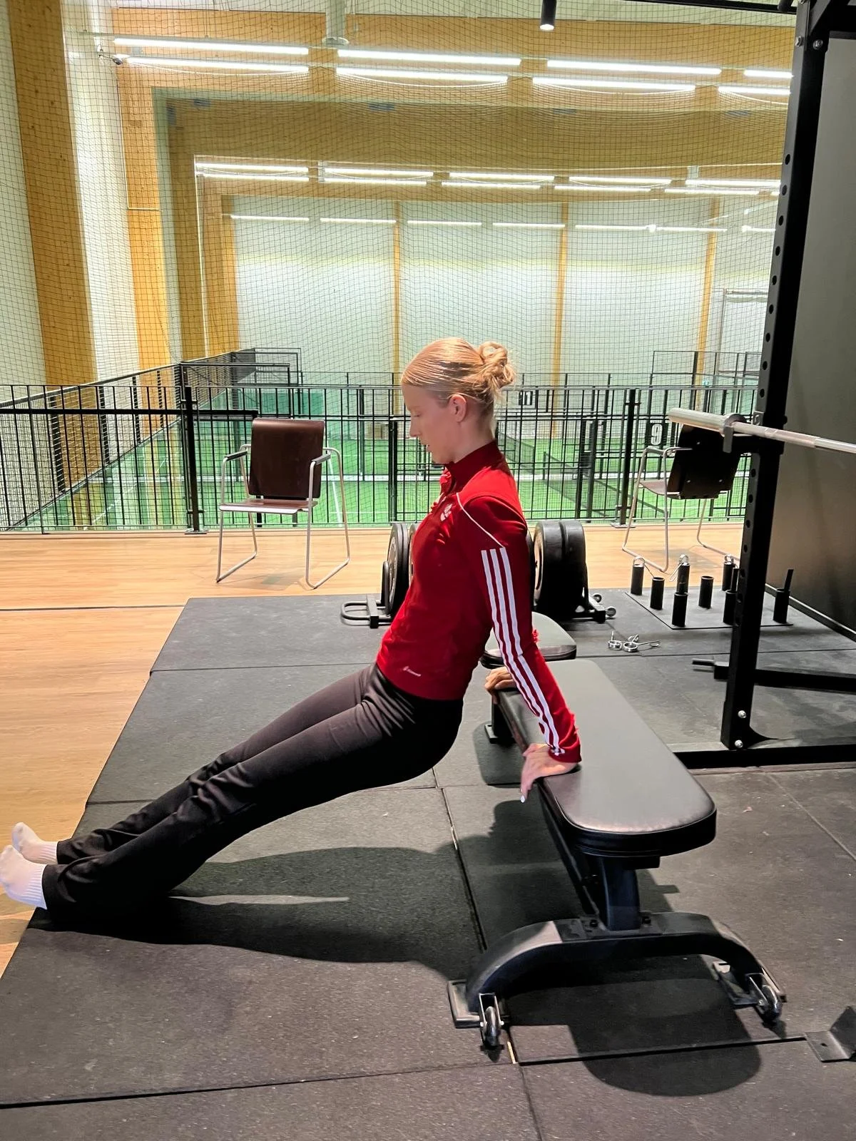 Käsi koukkuun pään taakse, paina kevyesti kyynärpäätä alaspäin.